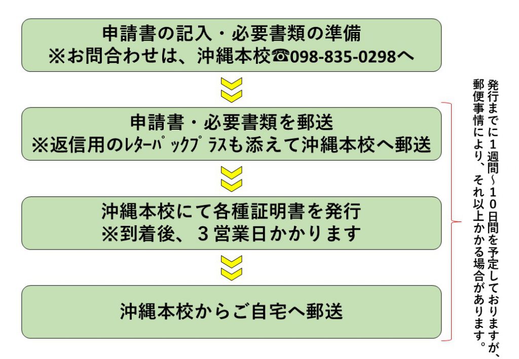* 「証明書交付願」等に加え、返信用のレターパックプラス(赤色)を添えて、沖縄本校までご郵送ください。